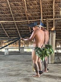 In the morning, we had breakfast with the villagers after which they told us about their culture and held a dance performance (which included us at one point). Breakfast included roasted grubs and termites; they were not particularly tasty (like the fruit). Later, the villagers came to the boat and accepted their gift bags of foodstuffs. The kids got their gifts, then Marcelo brought out a box of toys for them to play with, including Legos.