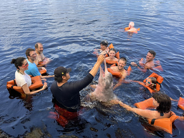 The next stop was a small concession where you could swim with the Amazon pink river dolphins. They would encourage them to approach by feeding them fish. After grabbing a fish, one of them swam right between my legs. Wild.