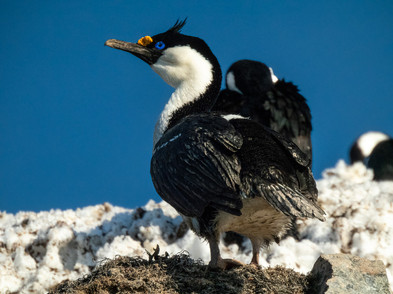 The next day we attended some lectures in the morning. Because the weather was nice and the sea was calm, we powered on to the Penninsula, saving the South Shetland Islands to the north for the return trip. We saw our first icebergs and by afternoon, spotted land. In the early evening we did our first Zodiac cruise. We skirted the shore of Harry Island and explored the beautiful ice formations and an imperial shag colony (a type of cormorant). We also saw our first Weddell seal. In the evening we enjoyed a beautiful sunset in the lounge.