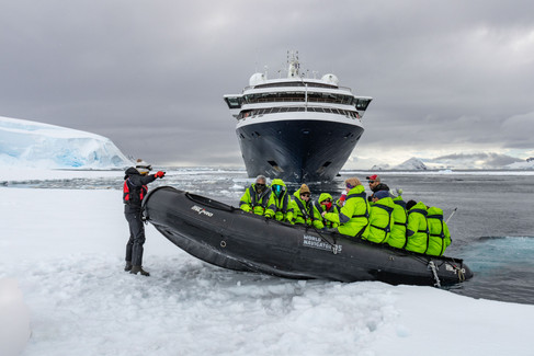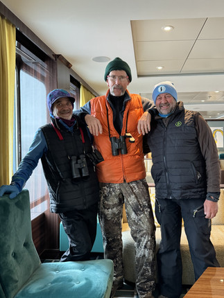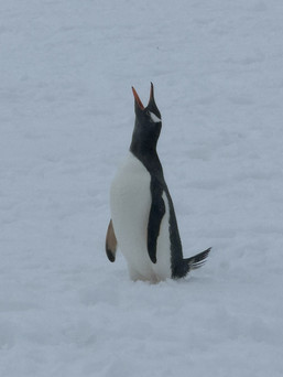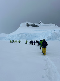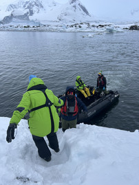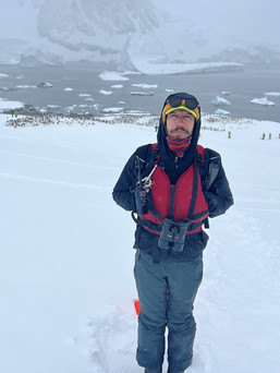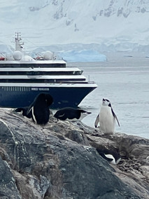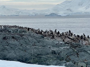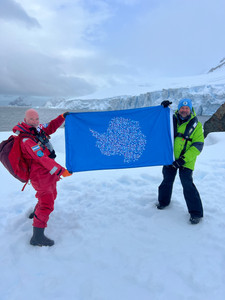 In the afternoon we went to Alford Bay where Fernando unfurled his new flag of the Antarctic continent. The flag, designed by the British man who designed the original Antarctic flag, is similar to the original, but the continent is filled in with images of pieces of plastic. Earlier in Fernando's lecture on the Antarctic Treaty, he told us about the discovery of microplastics found in Antarctica in 2022. Microplastics (less than 5 mm in diameter) have been found everywhere in the continent - in snow, water, and in the feces of penguins and other seabirds. They arrived in the continent by long distance airborne transport and likely from local sources of nearby research stations.