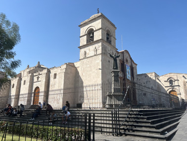 Arequipa is Peru's second largest city and a major cultural, economic, and political center. It is known as the Lion of the South (el Leon del Sur) because of its streak of independence during the history of Peru and rival to the political capital of Lima. It is also known as the White City (la Ciudad Blanca) because much of the city is built from a white or pink volcanic stone called sillar. Sillar is a type of rhyolite tuff from nearby volcanoes. Interestingly, while we were in Arequipa, our nephew's partner, Jen, was defending her PhD thesis in geology at Oregon State University. Her research was of the same type of volcanic rock from the Cascade volcanoes in Oregon. We listened to her defense presentation via Zoom while sitting in the Monastery of Santa Catalina de Sienna surrounded by the stone walls of rhyolite tuff.