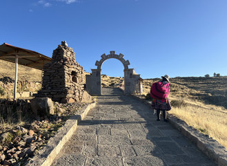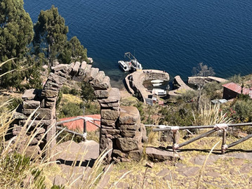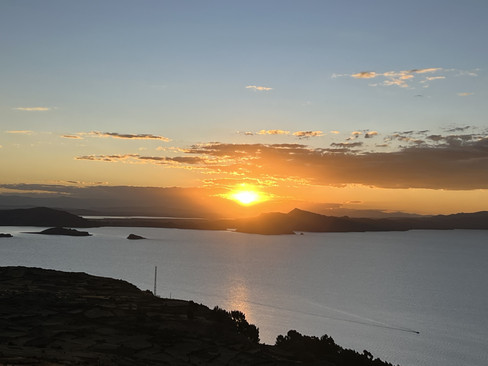 In the afternoon before dinner, I walked with our tour group to the top of one of two mountains on the island called Pachatata and Pachamama ("father earth" and "mother earth"). The two mountains have ancient ruins at the summits that pre-date the Incas. The ruins are closed during most of the year except one day when the islanders gather for a special ceremony. It was a steep climb to the top (and at over 13,000 ft), but well worth the effort for the view and spectacular sunset. Once at the top, I walked counter-clockwise three times around the ruins and left some coca leaves as a tribute. I also had a nice visit with one of our guides.