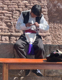 The third island was Taquile Island with another proud and special people. Taquile is known for their handwoven textiles (recognized by UNESCO as "Masterpieces of the Oral and Intangible Heritage of Humanity"). Our tour walked up the hill to the main town, where we found some excellent coffee, then were treated to a dance exhibition and a demonstration of weaving and knitting ,and learned about the local culture. Young men are those that do the knitting, while the women are the weavers. We bought a handwoven belt that is unique to their culture.