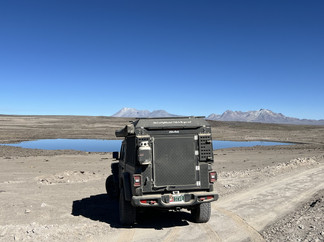 The next evening after visiting the Mirador Cruz del Condor and some other towns, we headed up into the mountains to explore. We visited a geyser that was a fountain of hot water continually shooting out of the ground. On the way, we helped a Peruvian couple that got stuck trying to get up the road. Afterwards we found a beautifully lonely place to camp above the canyon with a nice view of the active volcano Sabancaya. As the volcano spewed steam and ash, I couldn't help wondering if it wasn't a bit dangerous and that it might spew a larger eruption with a pyroclastic flow.