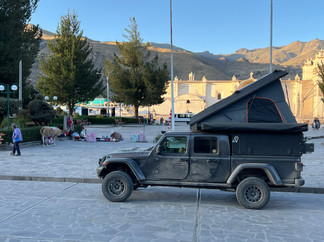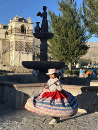 Another wonderful aspect of Colca Canyon is the strong indigenous culture of the towns and countryside. We spent the first night parked at the plaza in the town of Yanque. When we arrived, a nice woman approached us and asked us if we needed directions or information. She told us about the town and that it was okay to sleep in the plaza. She also mentioned that she had a restaurant nearby, which we decided to check out. It was delicious. I had lomo saltado de alpaca and Sheri had roasted chicken. We sat and talked with her and her husband for a while and enjoyed some great music videos on their television (including from Playing for Change). Turns out he is quite a fan of blues music. They were so nice and she gave us her phone number in case we needed anything. After dinner, we headed to the plaza to park for the night. As soon as we arrived, a large group of dancers and a band came around the corner and paraded around the square. It was part of a festival of the bulls that weekend. Very special. Yanque is also known for the traditional "wititi" dance, recognized by UNESCO as an Intangible Cultural Heritage of Humanity. It is performed for tourists every morning by girls and women, young and old. The dance starts at about 7 am and lasts for about an hour, accompanied by a market of traditional crafts. We woke up to the start of the dance and enjoyed watching.