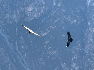 The Andean condor is the largest flying bird in the world. It weighs up to 33 lbs and has a wingspan of more than 10 ft. (The wandering albatros has a larger wingspan of 11-12 ft.) It is an incredible flyer. Because they are so heavy, they have a difficult time getting off the ground (particularly after they have gorged themselves on some dead animal). But once aloft, they rarely flap their wings. A recent study attached recording equipment to some condors in Argentina that recorded each wingbeat over more than 250 hours of flight time. They found that the birds flapped their wings only 1% of the time. One bird flew for more than five hours and more than 100 miles. They tend to be in areas with consistent winds. The Mirador Cruz del Condor in Colca Canyon is one such place. You can be pretty much assured to see condors there in the morning after sunrise when the warming air creates consistent breezes around the corner of the canyon. It was so special watching these huge birds soaring back and forth past us without flapping their wings. Spectacular.