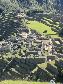 We spent the night at the Aguas Calientes, the town on the river below the site. We reached Aguas Calientes the prior evening by train, a beautiful ride. From town you reach the site via tourist bus. With our guide, we hiked up to the terraces above the main part of the site (including the hike to the Inca Bridge). We had an early entry time, and as it turned out, we were able to spend nearly four hours there - twice what we thought we would. The ruins and the agricultural terraces are in great shape. It is amazing to see how the Incas fit the stones together so precisely to achieve such incredible structures without the use of mortar (a type of building using cut stones fit tightly together called ashlar). The setting of the site between two peaks is truely spectacular.